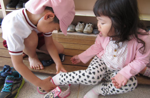 毎月仲良しデーを設け、3,4,5歳児が各年齢別に3名1グループをつくり、誕生会や散歩、すいか割りなど一緒に遊び、お別れ会はお互いがプレゼント交換もしています。