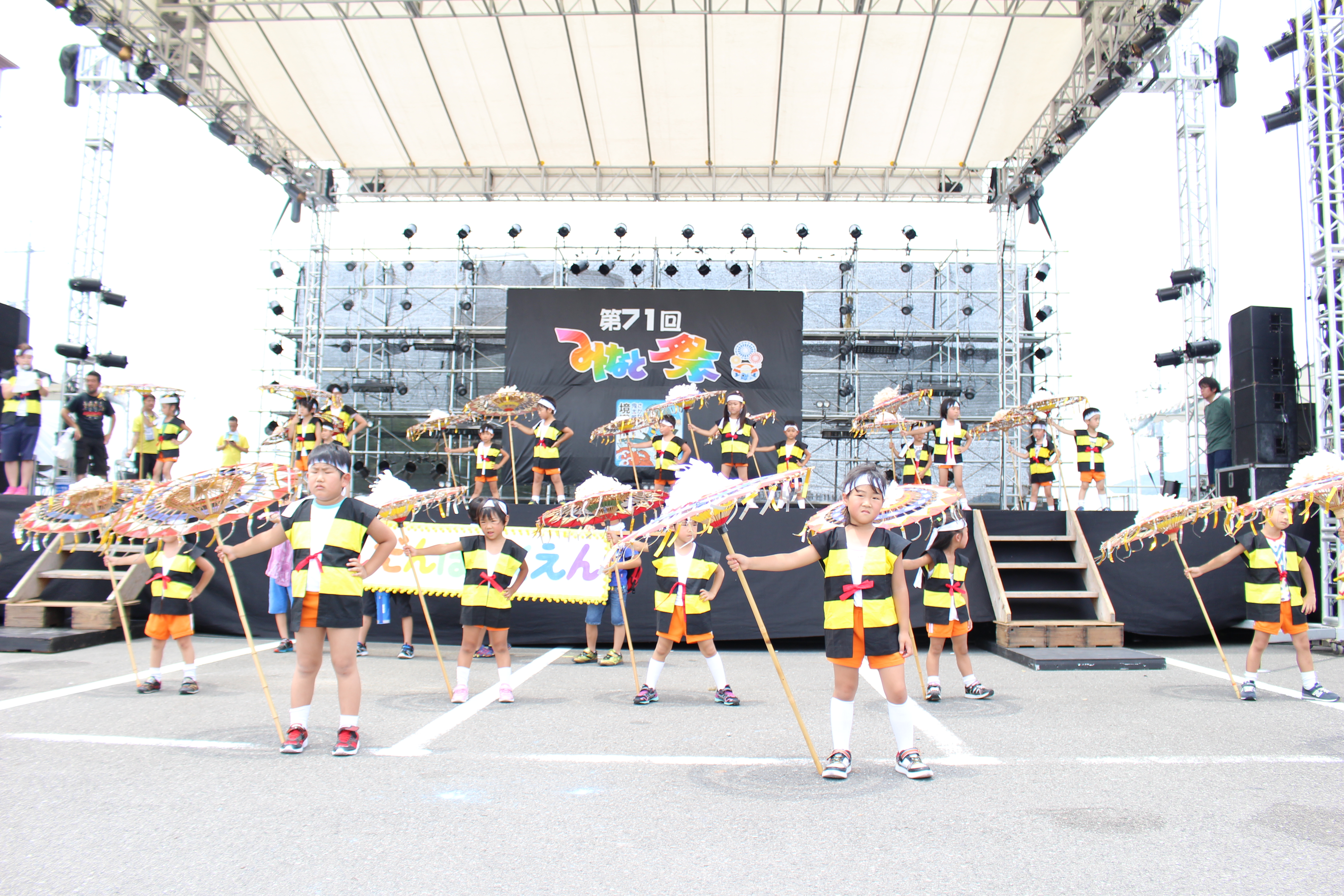 夏に開かれる「みなと祭」では、年長児が毎年ステージで傘踊りを披露しています。子ども達のキラキラ輝く姿を見ていただき、地域の方々と共にお祭りを盛り上げています。子ども達の堂々たるたくましい姿に、たくさんの感動と喜びの声をいただいております。