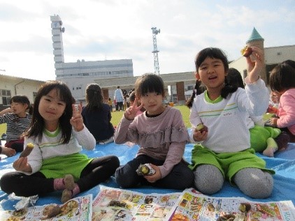 『畑はないけどプランターあるで』ということで、プランター栽培活動、保育園から車で5分ぐらいの距離にある畑の一部を借りてサツマイモを育て、園庭で焼き芋パーティーをするなど食育活動にも力を入れています。